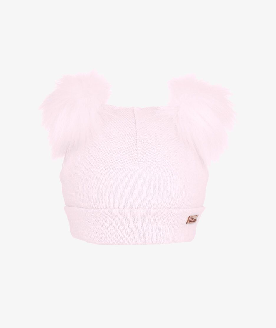 Zimowa, ocieplana czapka wykonana z dzianiny bawełnianej, wykończona dwoma akrylowymi pomponami.