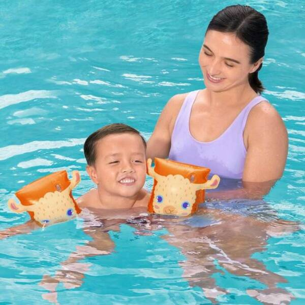 Bezpieczna zabawa w wodzie tylko z rękawkami do pływania z Bestway. Pływaczki Lama przedstawiają sympatyczne zwierzę, które przekona malucha do zabawy w wodzie. Każdy z rękawków posiada 2 komory powietrzne, w efekcie czego utrzymują one dziecko stabilnie na powierzchni wody.