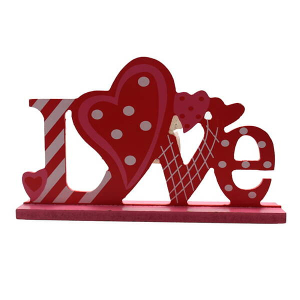 Dekoracja z napisem LOVE wykonana jest z drewna , w kolorze czerwono z białymi oraz różowymi zdobieniami. Napis przymocowany jest do drewnianej podstawki w kolorze różowym. Może służyć jako stylowa dekoracja na walentynki wesele lub ozdobą do każdego wnętrza.