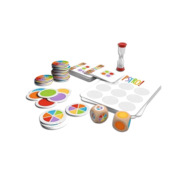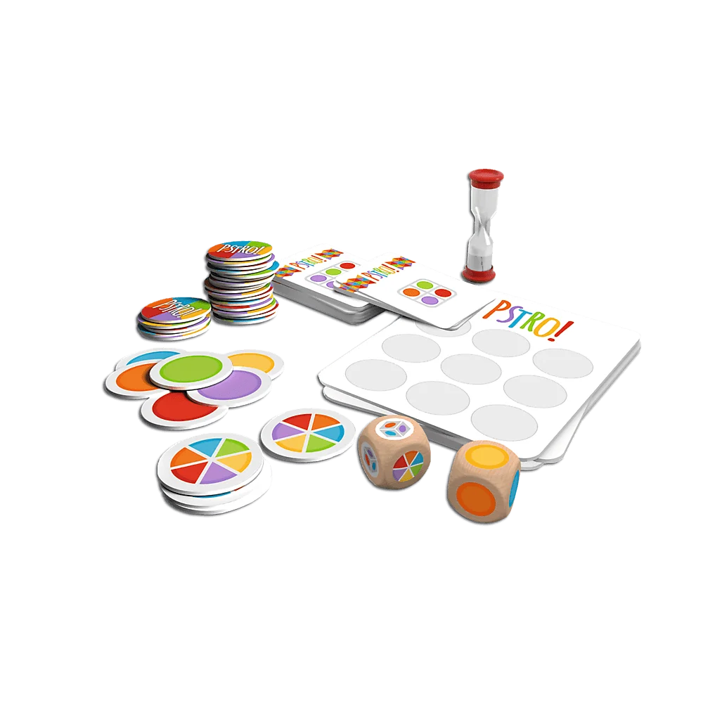Pstro! to dynamiczna gra pamięciowa z wykorzystaniem plansz, żetonów, kart i kostek. Jej zasady są tak proste, że wystarczy chwila rozgrywki, żeby je poznać bez zagłębiania się w instrukcję.