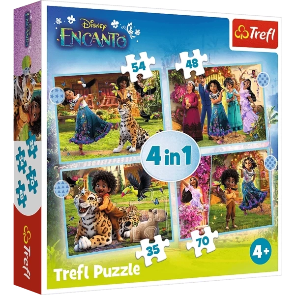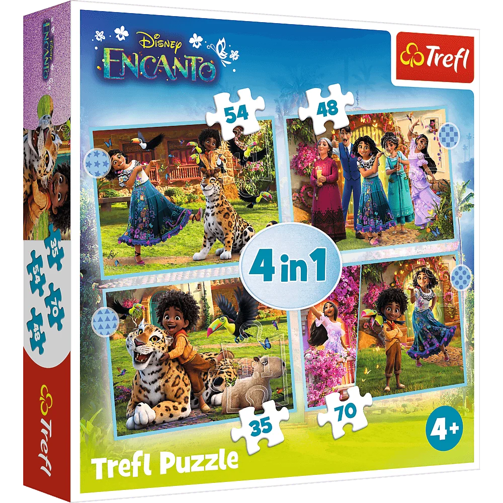 Nasze magiczne Encanto to puzzle dla dzieci składające się z 4 niezależnych układanek, zaprojektowane z myślą o wszystkich miłośnikach bajki Nasze magiczne Encanto. Po ułożeniu puzzli powstaną cztery obrazki o wymiarach 285 x 205 mm każdy. Zróżnicowana liczba elementów (35, 48, 54, 70) pozwala na zabawę zarówno młodszym, jak i nieco starszym fanom puzzli.