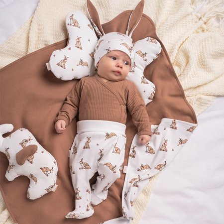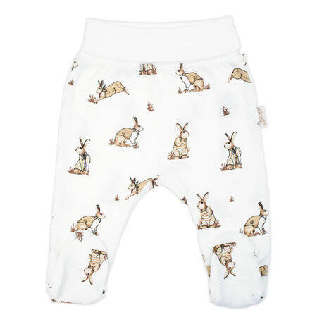 Wygodne i miękkie półśpioszki dla maluszka. Uszyte ze przewiewnej drukowanej, kremowej bawełny w zajączki, w odcieniach brązu. Wysoka jakość materiału została potwierdzona certyfikatem Oeko-Tex Standard 100 Tekstylia godne zaufania. Półśpioszki mają luźny fason i lekko obniżony stan by pomieścić pieluszkę, posiadają szeroki, bezuciskowy pas zapewniający pełny komfort maluszkowi.