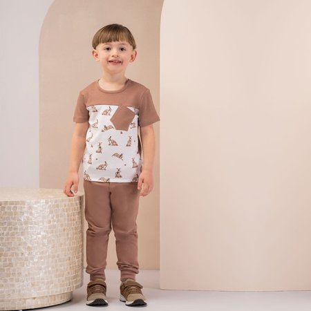 Uniwersalne spodnie dresowe dla chłopca, wykonane z brązowej bawełny z niewielką domieszką elastanu co sprawia, że materiał nie odkształca się. Spodnie posiadają ściągacz w pasie oraz przy nogawkach. Produkt zdobią kieszonki oraz imitacja rozporka.A w rozmiarze 56-68 zastosowano również imitację kieszonki. Idealne na różne okazje.Materiał całkowicie bezpieczny ,posiada certyfikat Oeko-Tex Standard 100 Tekstylia godne zaufania.