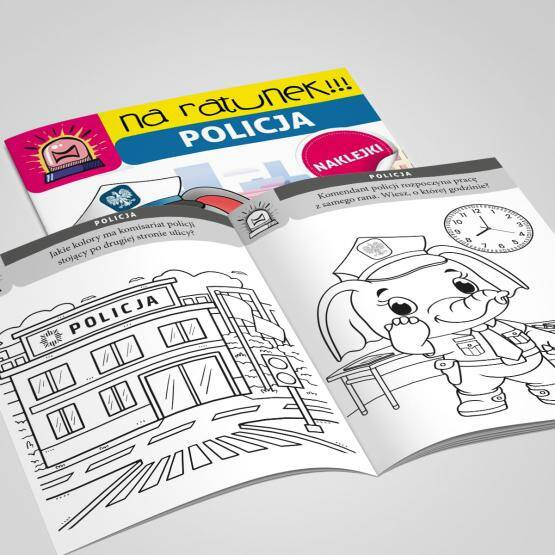 Aktywizujące kolorowanki „Na ratunek!!!” składają się na serię trzech tytułów: „Policja”, „Pogotowie” oraz „Straż pożarna”. Książeczki przybliżają dziecku codzienną pracę służb mundurowych interweniujących w niebezpiecznych sytuacjach, służb medycznych ratujących ludzkie zdrowie i życie oraz straży pożarnej walczącej z żywiołem pożaru i jego skutkami. Połączenie ciekawych zadań z kolorowaniem zapewnia dziecku pasjonującą zabawę, dającą wiele radości i satysfakcji. Kolorowanki uzupełniono atrakcyjnymi naklejkami.