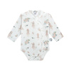 Rozpinane body dla niemowląt uszyte z miękkiego i delikatnego materiału, bardzo przyjemnego w dotyku. Ze starannie wyselekcjonowanej bawełny organicznej. Body zapinany jest na antyalergiczne bezniklowe napy. Wygodne kopertowe zapinanie sprawia, że jest bardzo proste do zakładania dla rodziców.