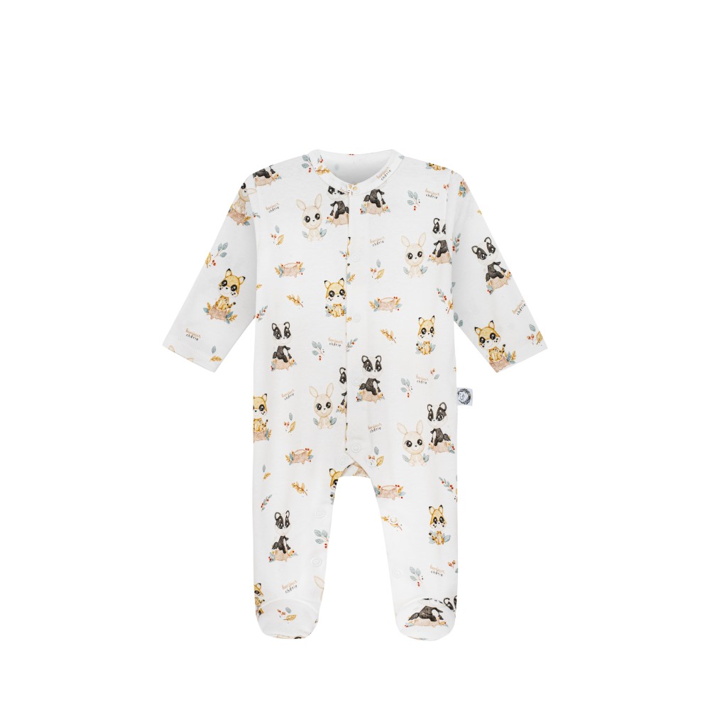 Pajac wykonany z delikatnej, mięciutkiej bawełny, starannie uszyty. Posiada napki przez całą długość oraz w kroku pozwalające na szybkie, sprawne przewinięcie i przebranie dziecka. Z tej serii można dokupić również inne ubranka.