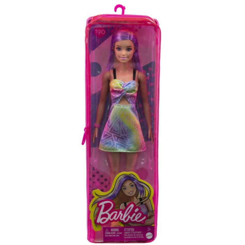 Niezwykła linia lalek Barbie Fashionistas prezentuje różne typy sylwetki oraz zróżnicowane połączenia odcieni skóry, fryzur, kolorów oczu i włosów, a także mnóstwo ubranek inspirowanych najnowszymi trendami. Lalka Barbie o standardowej sylwetce jest ubrana w uroczą sukienkę z wycięciem i wielokolorowym nadrukiem oraz zielone buciki sportowe na koturnie. Ma także długie blond włosy z modnymi fioletowymi pasemkami i bransoletkę. Winylowe opakowanie wielokrotnego użytku z suwakiem idealnie nadaje się do przechowywania lalki lub ubranek i akcesoriów Barbie. Można je też dowolnie ozdobić, np. za pomocą naklejek. Odkryj wiele możliwości zabawy.