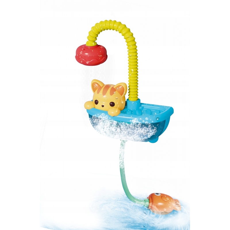 Razem z kotkiem przeżyj wodną przygodę pełną mydlanych bąbelków! Wybierz jeden z dwóch trybów i zmień kąpiel w czystą radość. Przymocuj zabawkę do ściany wanny za pomocą przyssawek, zanurz wężyk z rybką w wodzie i ustaw przełącznik na pozycję prysznic, aby bawić się w strumieniach wody! Napełnij kocią wannę wodą z dodatkiem płynu do kąpieli powyżej poziomu pompki, znajdującej się pod kotkiem, i przełącz się na tryb bąbelków, aby uruchomić generator piany. Zabawka wymaga użycia 3 baterii AA, baterie nie są zawarte w zestawie.