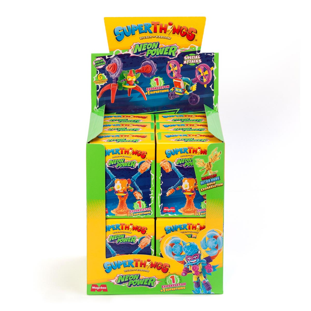 Po raz pierwszy w świecie SuperThingsów pojawiły się Egzoszkielety! Te zbroje mają ruchome ramiona, a ich specjalne ataki są bezkonkurencyjne! Dzięki technologii Professora K połączonej z neonową mocą Color Flasha, stały się trudne do pokonania! Bohaterowie i Złoczyńcy, SuperThingsy i Kazoom Kidsy - teraz wszyscy mają do nich dostęp, dzięki czemu walka będzie bardziej zacięta niż zwykle. Do zebrania jest 6 modeli, a wśród nich ukrywa się również Egzoszkielet w złotym kolorze!