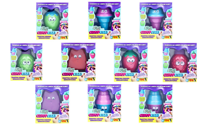 W asortymencie: 10 różnych slimów, 5 rodzajów w 2 różnych kolorach: truskawka, ananas, babeczka, lód i lód na patyku.
