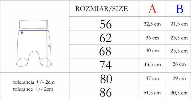 Półśpioszki mają luźny fason i lekko obniżony stan by pomieścić pieluszkę, posiadają szeroki, bezuciskowy ściągacz w pasie w kolorze czarnym - zapewniający pełny komfort maluszkowi.