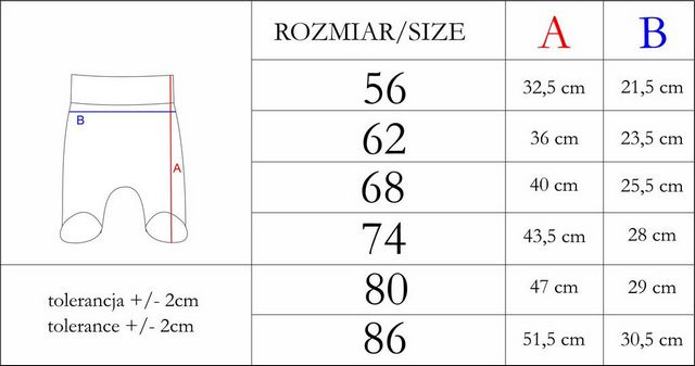 Półśpioszki mają luźny fason i lekko obniżony stan by pomieścić pieluszkę, posiadają szeroki, bezuciskowy ściągacz w pasie w kolorze czarnym - zapewniający pełny komfort maluszkowi.