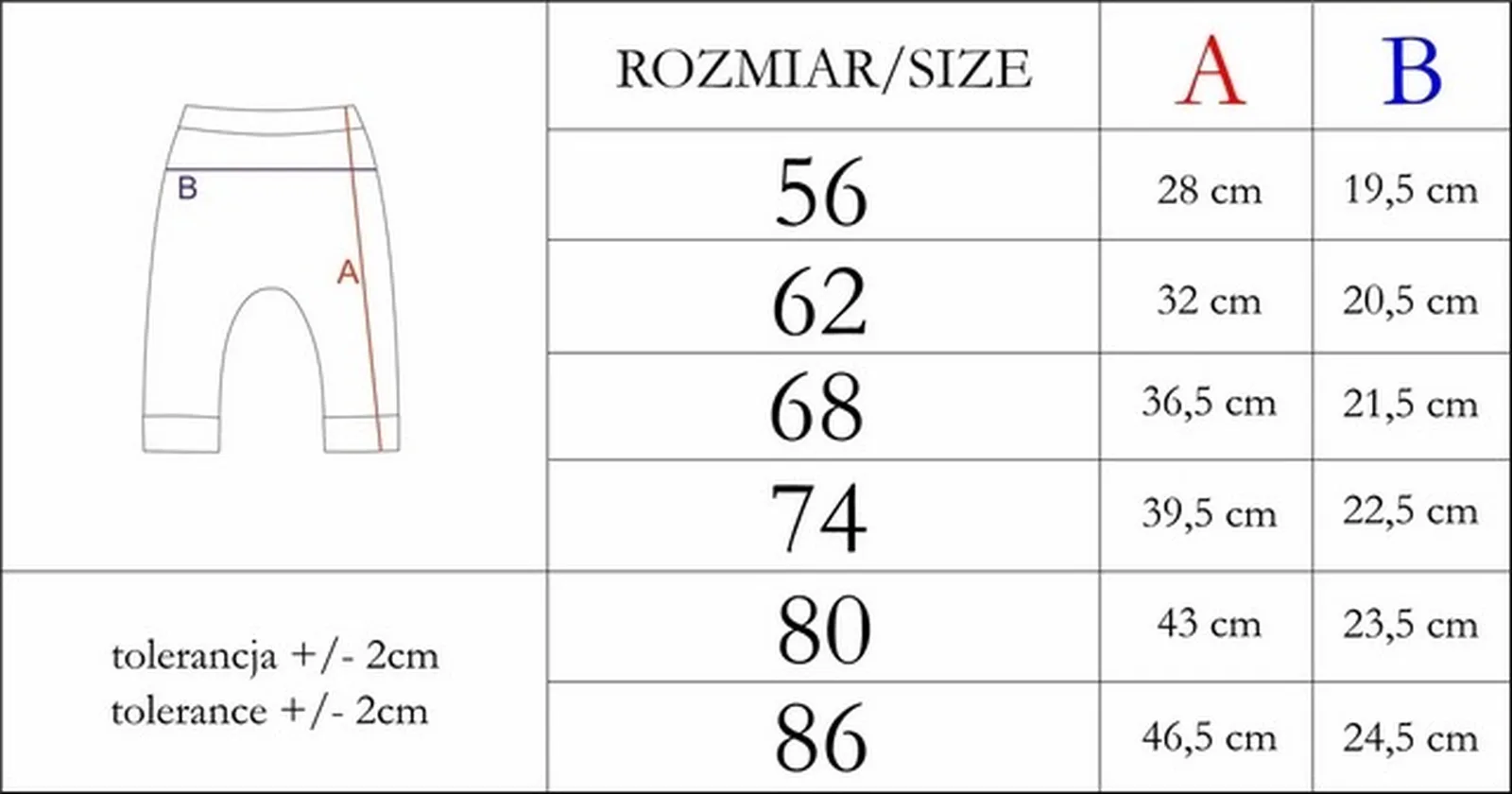 Spodnie posiadają gumkę w pasie od rozmiaru 68.