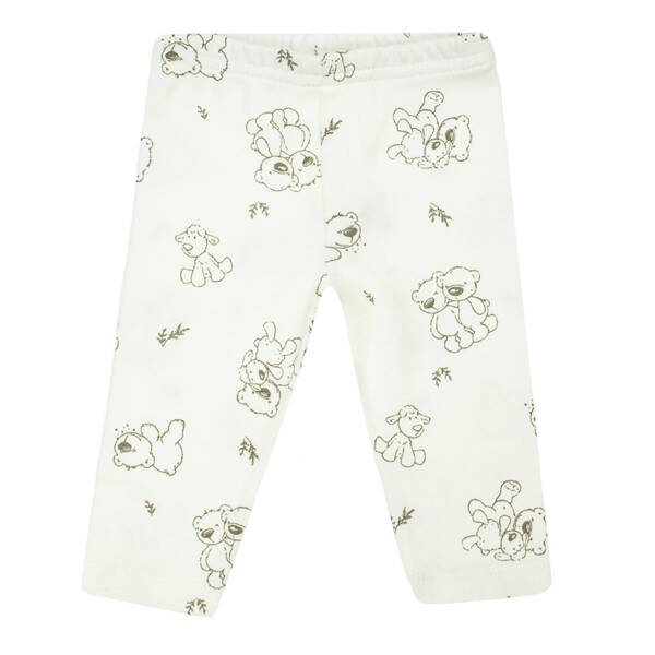 Kremowe spodnie uszyte z drukowanej bawełny w grafitowe misie i owieczki.
