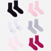 Dziewczęce skarpety dostępne w praktycznym sześciopaku. W stonowanej, wesołej kolorystyce, ozdobione na całości delikatnymi kropeczkami. Posiadają klasyczny krój, za kostkę. Są miłe w dotyku, dobrze układają się na stopie.