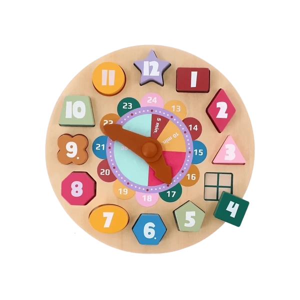 Tick Tock to zegar z klockami wykonany z drewna, który nie tylko pomaga dzieciom uczyć się o czasie, ale również rozwija ich zdolności manualne. Na klockach nadrukowane są liczby oraz kolorowe grafiki na dole, które ułatwiają dopasowanie ich do odpowiednich miejsc na zegarze. Dodatkowo, wżłobienia na zegarze ułatwiają precyzyjne ułożenie klocków.