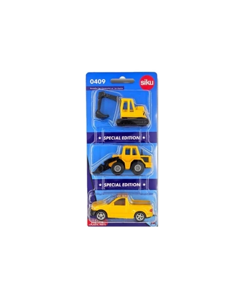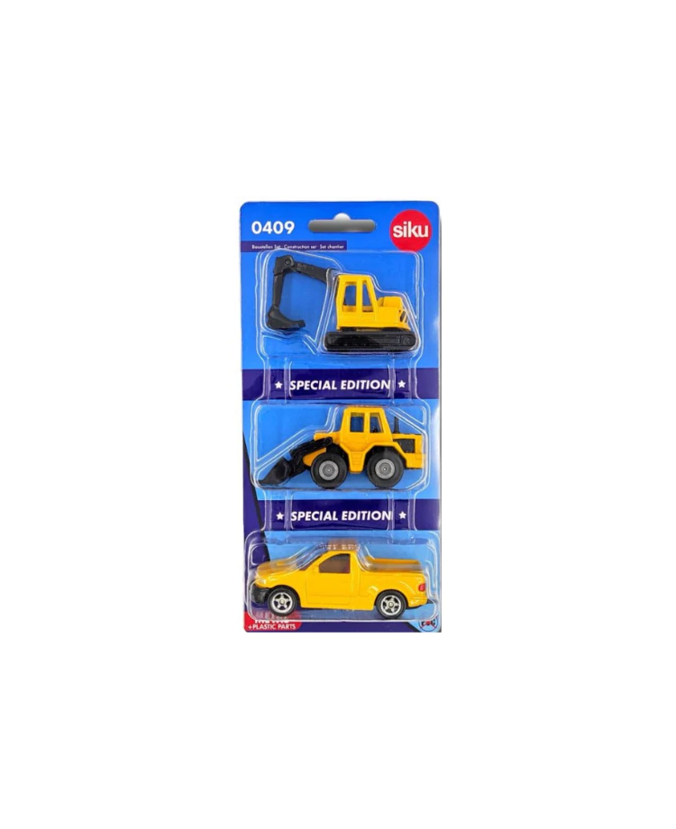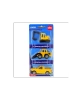 Zestaw trzech pojazdów budowlanych: koparka, koparko-ładowarka i pick-up w kolorze zółtym. Pojazdy budowlane zostały wykonane z metalowych i plastikowych elementów są odzwierciedleniem pojazdów rzeczywistych.
