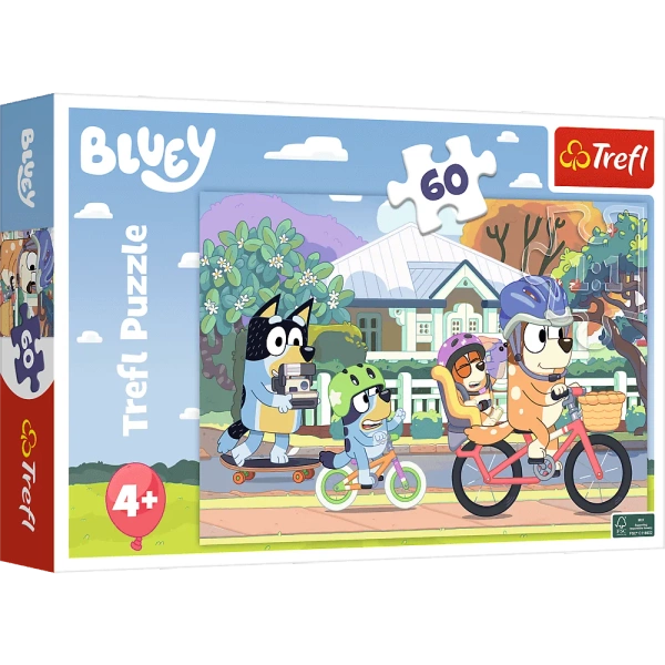 Puzzle przedstawiają wesołego Bluey z przyjaciółmi.