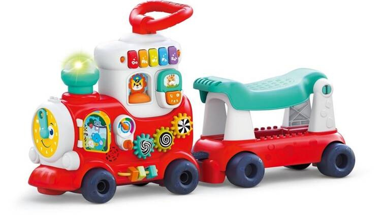 Kolorowy pociąg zabierze malucha na przejażdżkę z atrakcjami! Wyposażony jest w aż 4 różne tryby: siedzenie na wagoniku i odpychanie się nóżkami, odczepienie wagonika i chodzenie za ciuchcią, ciągnięcie wagonika, siedzenie przy ciuchci i zabawa aktywnymi elementami. Na małych odkrywców czeka tu wiele zadań, z pomocą których ćwiczyć mogą sprawność paluszków: tarcza zegara z ruchomą wskazówką, koraliki do przesuwania, książeczka ze stronami do przewracania, kolorowe trybiki do kręcenia i pianinko do tworzenia własnej melodii. Jeździk wyposażony został w światełko, wesołe dźwięki oraz melodie, a także regulację głośności, co pozwala dostosować go do potrzeb malucha.