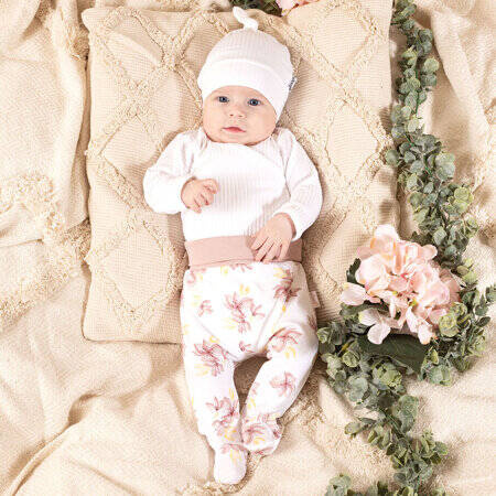 Wygodne i miękkie półśpioszki, uszyte ze 100% przewiewnej bawełny w kolorze kremowym w kwiatowy wzór. Wysoka jakość produktu została potwierdzona certyfikatem Oeko-Tex Standard 100 Tekstylia godne zaufania. Półśpioszki mają luźny fason i lekko obniżony stan by pomieścić pieluszkę, posiadają szeroki, bezuciskowy ściągacz w pasie zapewniający pełny komfort maluszkowi.