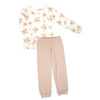 Bawełniana piżamka, z luźną bluzką z długim rękawem zakończonym ściągaczem. Spodnie w kolorze beżowym, posiadają w pasie wygodną gumkę, nie uciskającą brzuszka, która dodatkowo została przeszyta, aby zapobiec okręcaniu się. Dół nogawek zakończono ściągaczem. Bluzka z kremowej bawełny w kwiatowy wzór, rękawy zakończone ściągaczem. Bawełna, z której jest uszyta, posiada certyfikat Oeko-Tex Standard 100 Tekstylia godne zaufania.