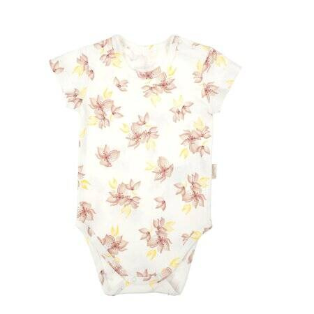 Body z krótkim rękawem dla dziewczynki, uszyte z kremowej bawełny w kwiatowy wzór. Posiada certyfikat Oeko-Tex Standard 100 Tekstylia godne zaufania. Zapinane na wygodne bezniklowe napy na ramieniu i w kroku, które ułatwiają ubieranie dziecka.