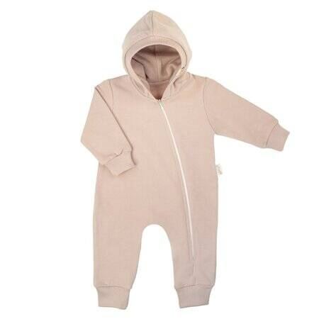Pajac dresowy w kolorze beżowym z dodatkiem elastanu. Idealny do wózka. Posiada ściągacze w rękawach, przy nogawkach oraz przy szyi. Dzięki wykonaniu z certyfikowanej bawełny dziecko będzie w nim się czuło wygodnie. Ozdobiony jest naszywką z motywem kwiatu.