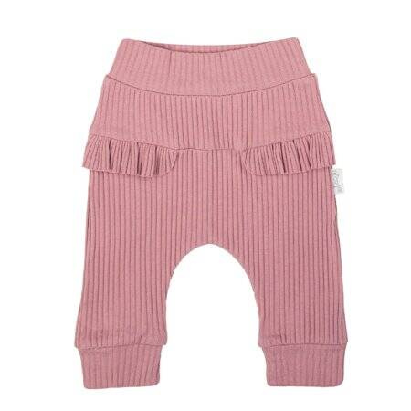 Nie krępujące ruchów, wygodne spodnie dla dziewczynki, uszyte z wrzosowego prążka. Ubranko w pasie posiada gumkę od rozmiaru 68. Przód zdobi karczek ozdobiony dwoma falbanami. Wysoka jakość produktu została potwierdzona certyfikatem Oeko-Tex Standard 100 Tekstylia godne zaufania.