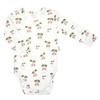 Body z długim rękawem, uszyte z białej drukowanej bawełny w wzór wisienek. Materiał posiada certyfikat Oeko-Tex Standard 100 Tekstylia godne zaufania. Ubranko rozpinane jest na ramieniu oraz w kroku na napy bezniklowe. Fason jest klasyczny, wygodny, będzie pasował do niejednej stylizacji.