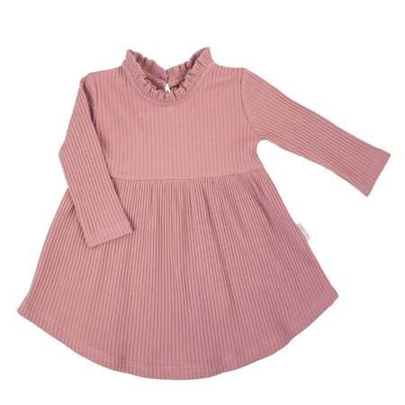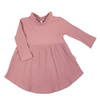 Stylowa sukienka z długim rękawem dla dziewczynki, wykonana z wrzosowego materiału w prążek. Materiał jest całkowicie bezpieczny dla skóry dziecka.
