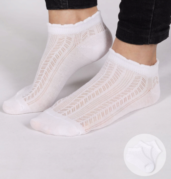 Dziewczęce, krótkie skarpety w kolorze białym. Dzięki ażurowej strukturze są przewiewne i miłe w dotyku.