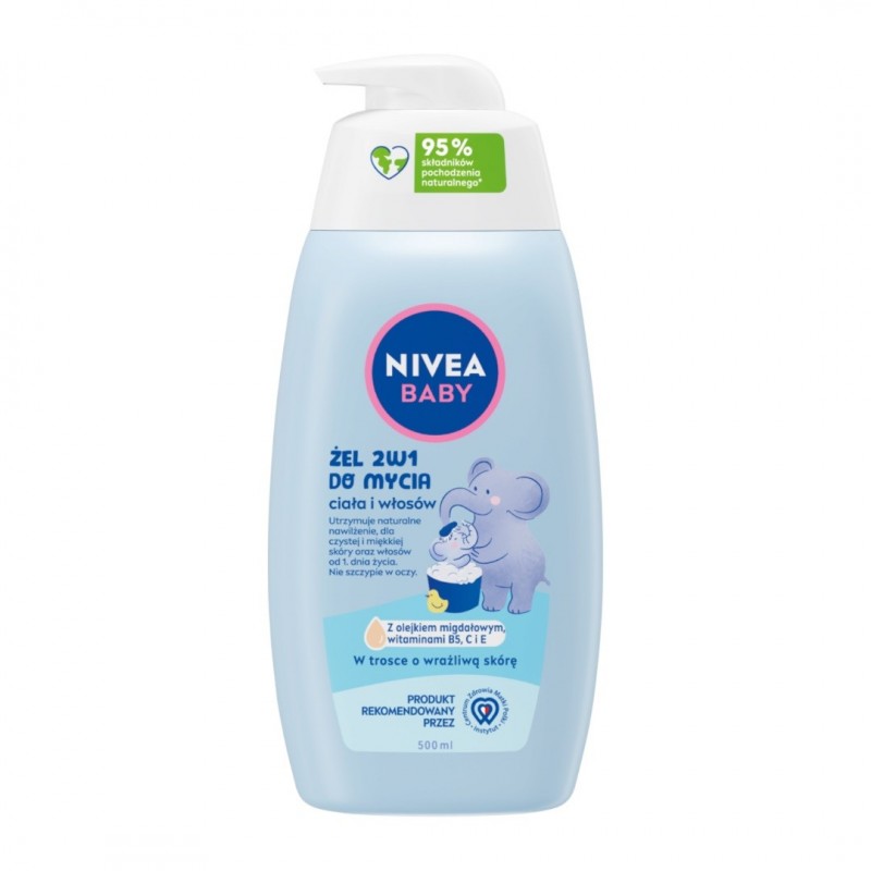 Odkryj NIVEA BABY Żel 2w1 do mycia ciała i włosów, który nie tylko łagodnie myje ciało i włosy, ale także pomaga utrzymać naturalne nawilżenie oraz chroni i wzmacnia skórę dziecka, wspierając jej naturalny proces rozwoju od 1. dnia życia. Zawiera w 100% naturalny olejek migdałowy i witaminy B5, C i E. Stworzony tak, aby minimalizować ryzyko alergii**. Produkt rekomendowany przez Instytut Centrum Zdrowia Matki Polki, a jego tolerancja dla delikatnej i wrażliwej skóry niemowląt i dzieci jest potwierdzona dermatologicznie. Formuły są łagodne i dbają o delikatną skórę dziecka i naszą planetę. Formuła jest wegańska, biodegradowalna* i nie zawiera mikroplastiku**.