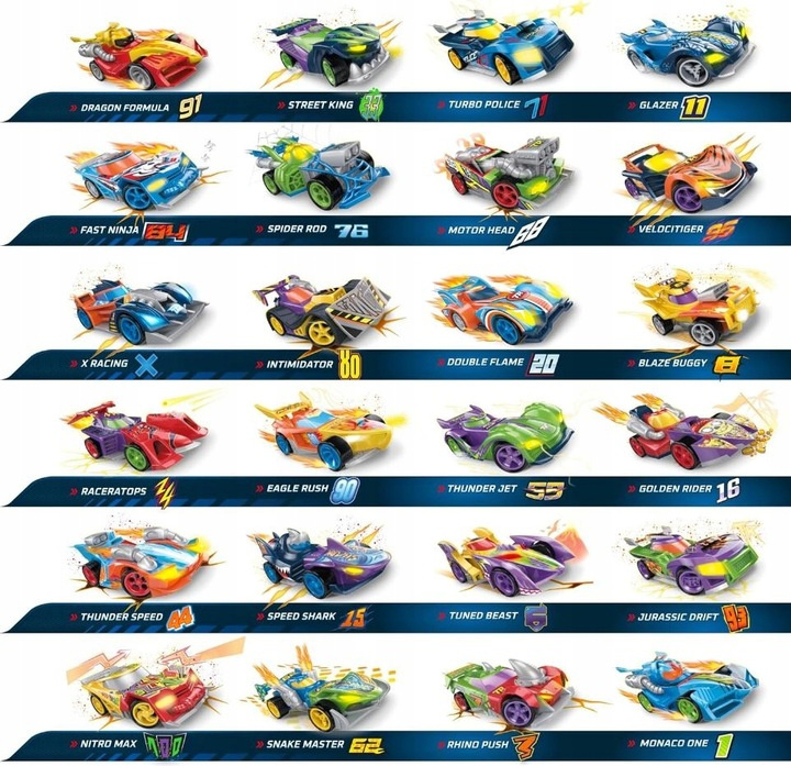 24 samochody do zebrania, każdy z systemem Mix 'N Race. Mieszaj: wymieniaj części i koła T-Racers, aby tworzyć własne niezwykłe projekty. Ścigaj się: zbudowane z myślą o prędkości, zawsze gotowe do wyścigu!