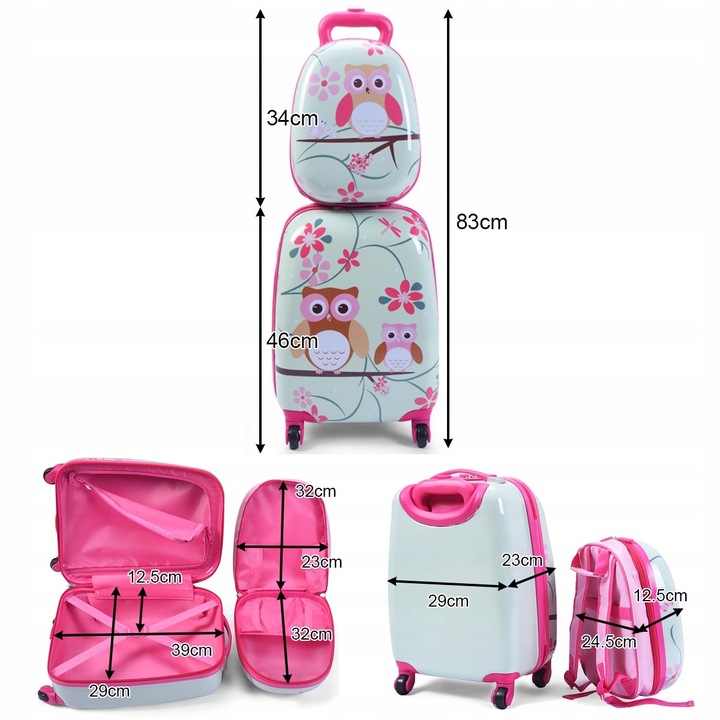 Uroczy i pojemny zestaw walizki z plecakiem z motywem sowy, który z pewnością przypadnie do gustu każdemu małemu podróżnikowi. Idealny na wyjazdy urlopowe, jak również na krótsze wyprawy.