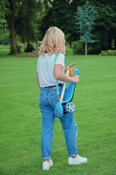 Transport i podróżowanie są również łatwe dzięki bezpiecznemu i intuicyjnemu mechanizmowi składania oraz paskowi do noszenia. Jeśli więc dziecko nie ma ochoty wracać do domu na hulajnodze możesz zgrabnie zmieścić hulajnogę w bagażniku samochodu złożyć ją do niewielkich rozmiarów i przekształcić w torbę z paskiem do noszenia lub idealną do zawieszenia z tyłu wózka.