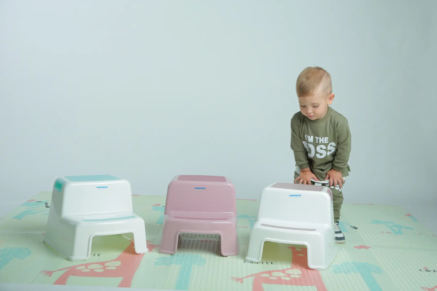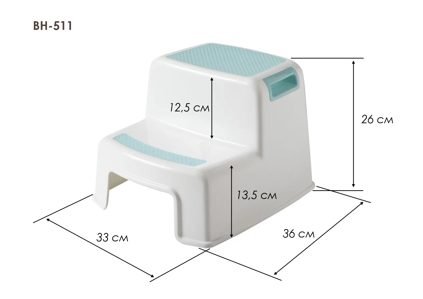 Stopień BH-511 Babyhood - korpus składa się z dwóch stopni o wysokości 13 cm każdy. Wykonany z trwałego tworzywa sztucznego z powłoką antypoślizgową. Gumowany spód pozwala na bezpieczne użytkowanie stopnia w toalecie i łazience. Dzięki wygodnym uchwytom dziecko będzie mogło samodzielnie przenosić stopień i stawiać go tak jak chce. Rozmiar: 36cm x 33cm x 26cm.