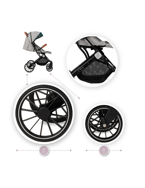 Wózek posiada zwrotne i odporne na przebicia koła, które zapewniają komfort jazdy. Ich duży rozmiar - 10”sprawia, że doskonale sprawdzają się nawet w najtrudniejszych warunkach. Centralny hamulec MoMi Estelle Dakar jest natomiast wygodny w użyciu.