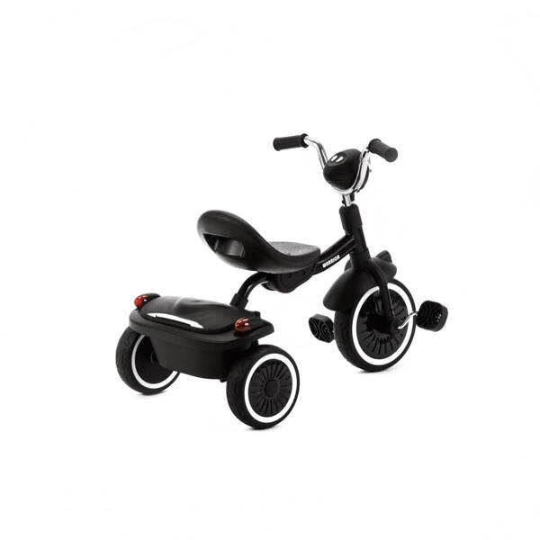 Znajdujący się z tyłu rowerka zamykany kuferek świetnie sprawdzi się jako schowek na drobiazgi i zabawki, a wytrzymałe koła wykonane z pianki EVA zapewnią długie użytkowanie. Warrior posiada również wygodne, antypoślizgowe rączki, światełko oraz kilka melodyjek. Moduł dźwiękowy w razie potrzeby można wyłączyć odpinając kostkę znajdującą się w pojemniku na baterie – wtedy zostaje tylko światełko.