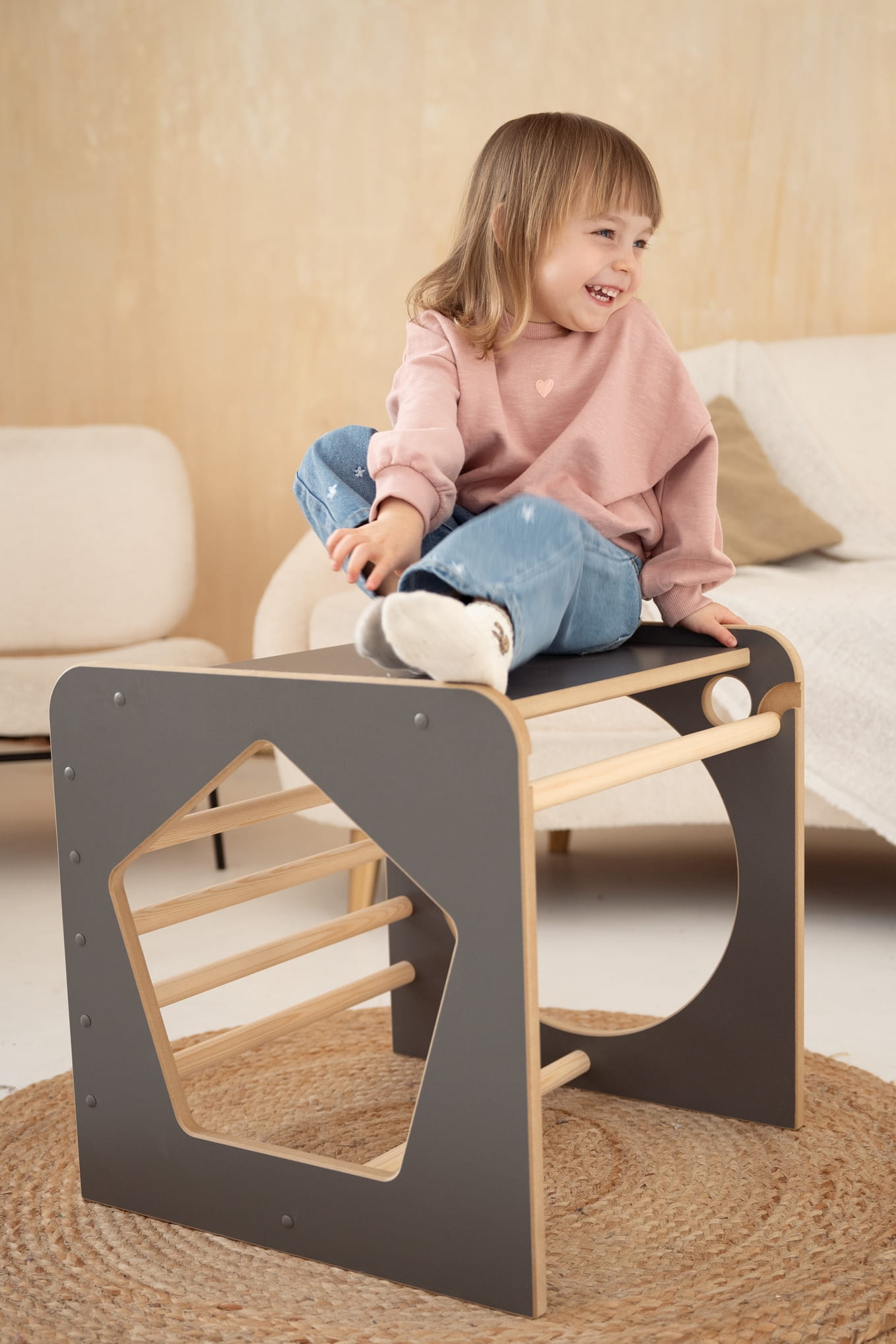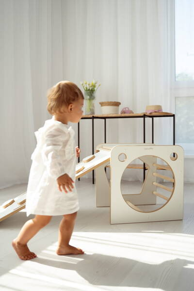 Z jednej strony KOSTKA ma szczebelki, po których można wspinać się na nią i ćwiczyć koordynację ruchową. Po bokach są otwory z figurami, które mogą służyć do nauki i zabawy - czyli przechodzenia między nimi. A na samej górze znajduje się blat, stworzony do rysowania, malowania i innych plastycznych czynności.