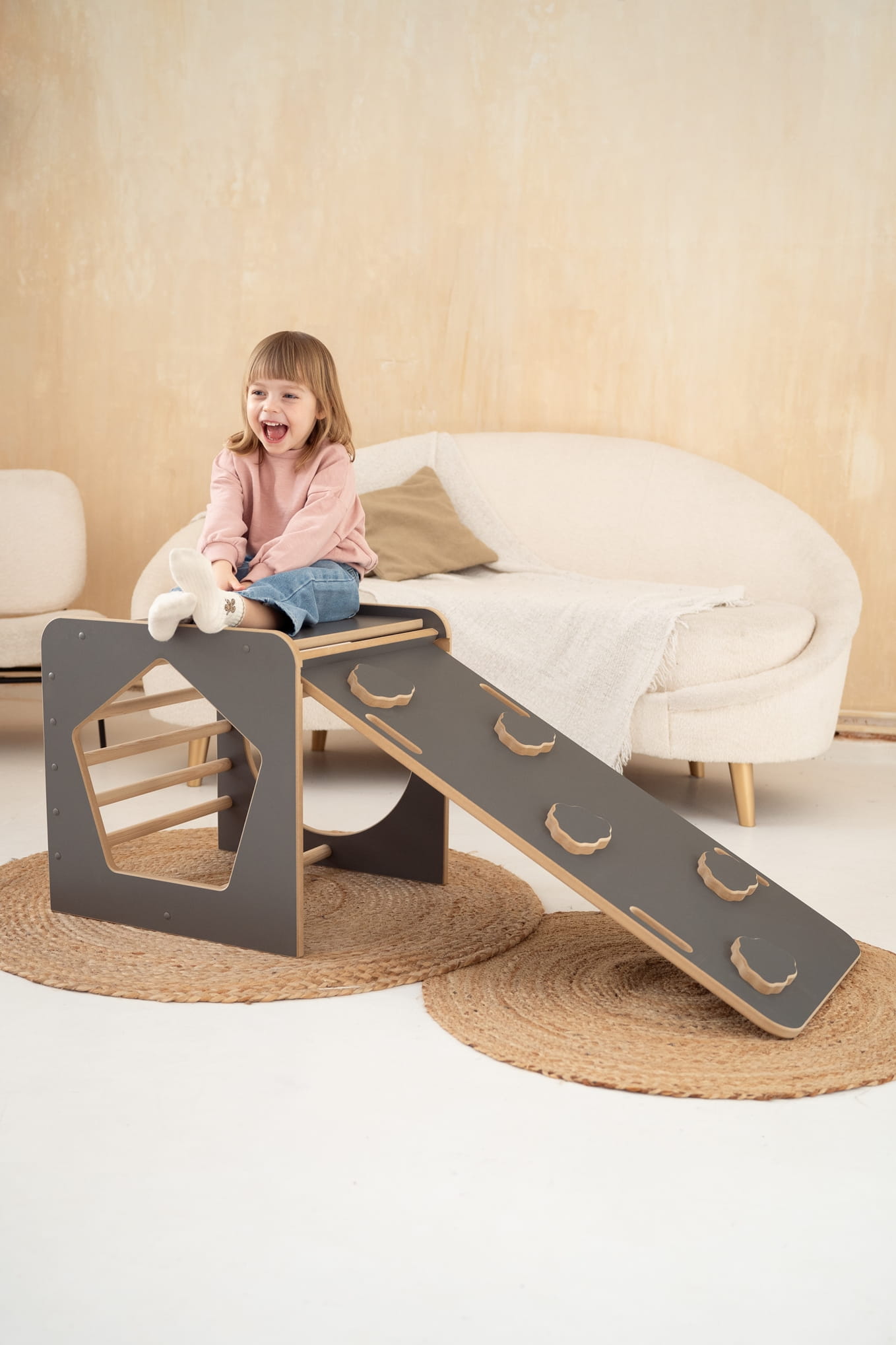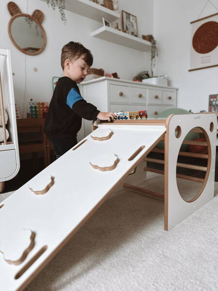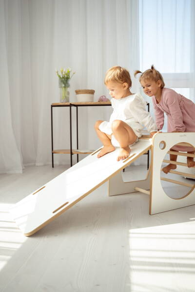 Przy ściance wspinaczkowej można zamontować zjeżdżalnie, która sprawi, że zabawa z kostką stanie się jeszcze fajniejsza! Z jednej strony jest gładka zjeżdżalnia, a z drugiej ścianka wspinaczkowa - wspinania się i zjeżdżania nie będzie końca, możemy to zagwarantować!