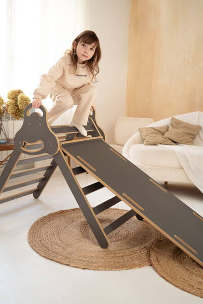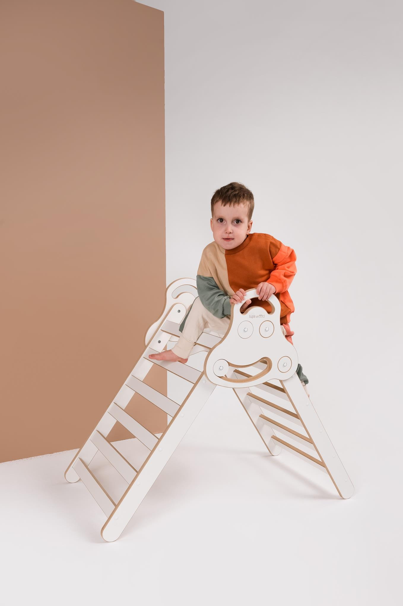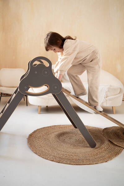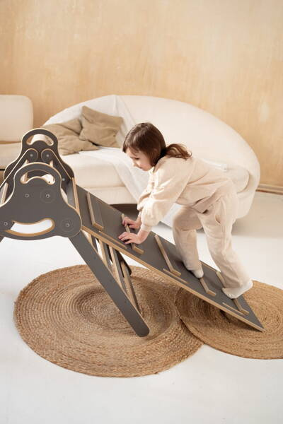 Pikler ze zjeżdżalnią w domu, to plac zabaw IDEALNY! Z jednej strony płyty jest ścianka wspinaczkowa, a z drugiej superśliska zjeżdżalnia. Jeśli masz już bujak, pikler idealnie dopełni cały zestaw - te elementy można połączyć zjeżdżalnią.