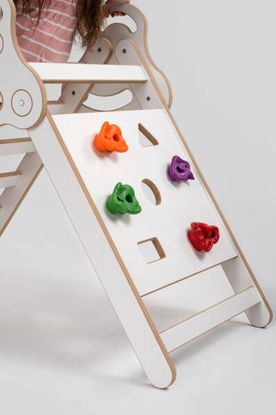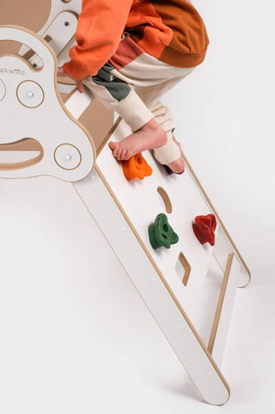 Zabawę urozmaicić mogą nasze zjeżdżalnie i ścianki wspinaczkowe! Dodatkowe elementy dostępne są na www. Jeśli masz już bujak, pikler idealnie dopełni cały zestaw - te elementy można połączyć zjeżdżalnią.