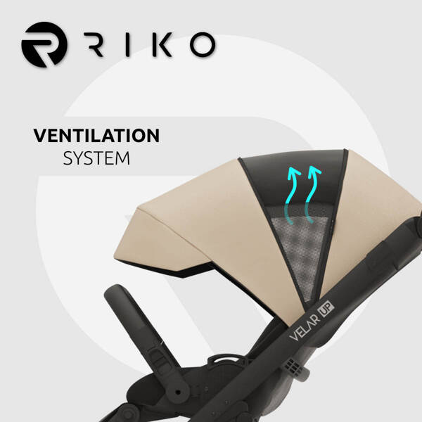 Wózek RIKO VELAR UP dostępny jest w 6 modnych kolorach. Budki przeciwsłoneczne zostały wykonane z modnej skóry ekologicznej, a pozostałe elementy zewnętrzne tapicerki z tkaniny 3D (plaster miodu). Wnętrze siedziska spacerowego wykonane zostało z  miękkiej i przyjaznej dla dziecka dzianiny w praktycznym czarnym kolorze. Tkaniny zewnętrzne posiadają impregnację zapewniającą spływanie wody oraz filtr UV50+ chroniący dziecko przed szkodliwym promieniowaniem i utrwalający kolor tkaniny.