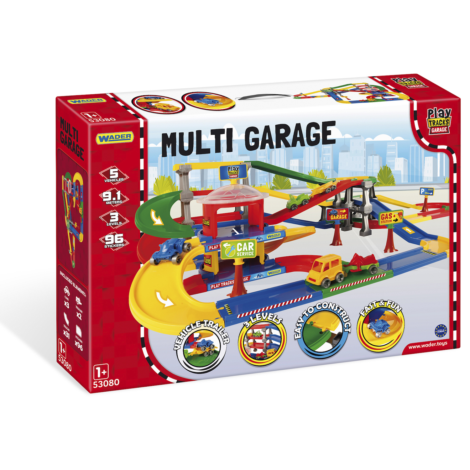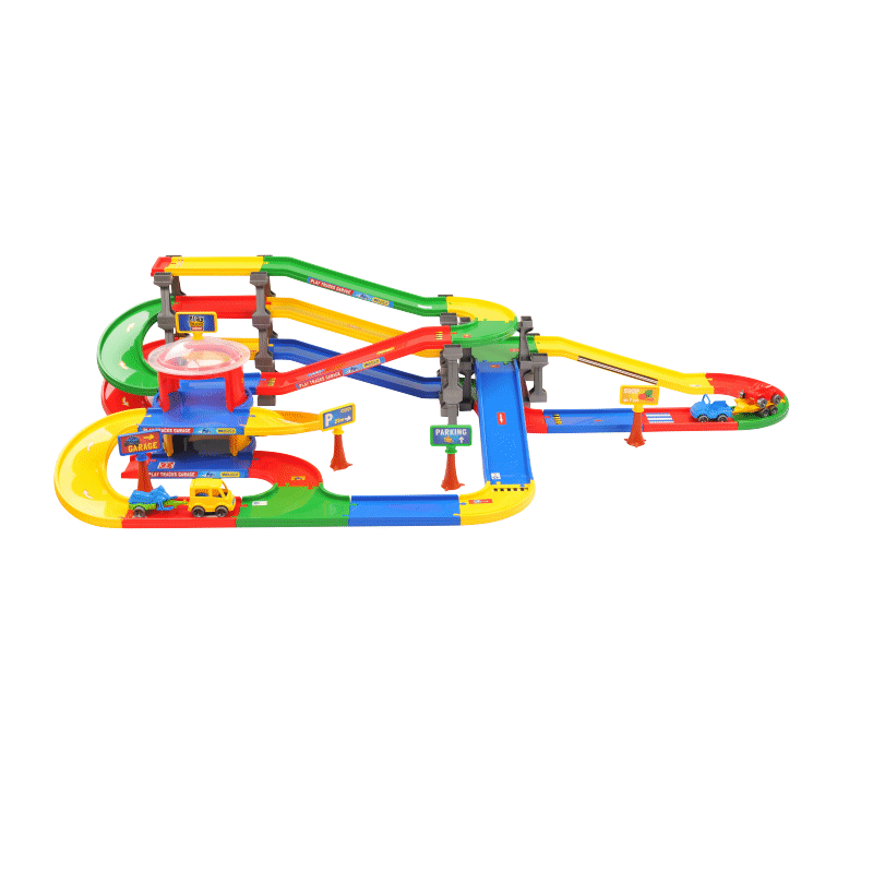 Parking wielopoziomowy z serii Play Tracks Garage rozpali serce każdego młodego fana motoryzacji. Nowoczesna, lekka i prosta w montażu konstrukcja pozwala na ułożenie tras w różne kształty i zapewni Twojemu dziecku wiele radości i godzin wspaniałej zabawy. Z różnokolorowych elementów powstaje piętrowy system dróg o łącznej długości 9,1 m i dwupoziomowa stacja parkingowa. Do zestawu dołączone są dekoracje, naklejki oraz 5 pojazdów – jedno autko Kid Cars Sport oraz 2 samochody Kid Cars Sport z przyczepkami, na których znajdują się dodatkowe pojazdy.