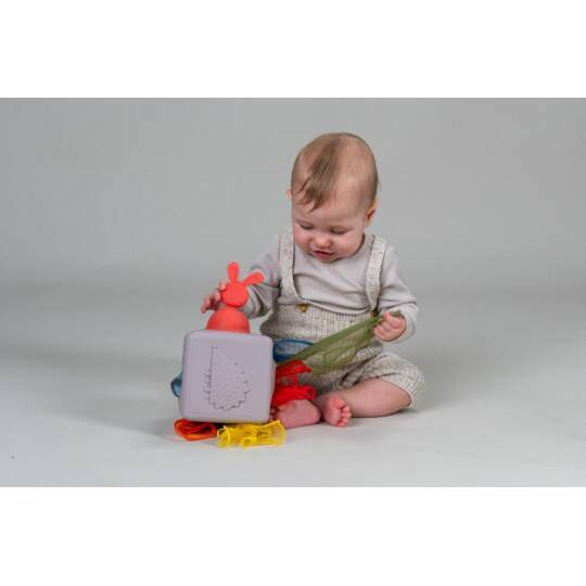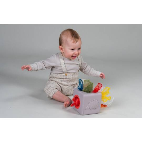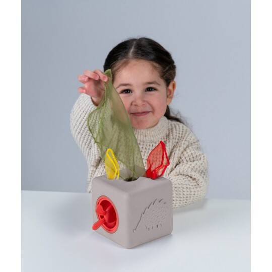 Pojemnik z chusteczkami został zainspirowany fascynacją małych dzieci mokrymi chusteczkami i pudełkami na chusteczki. Maluchy uwielbiają wyciągać chusteczki z pojemników i rozkładać je po podłodze. Główny otwór w pokrywie pudełka został specjalnie zaprojektowany tak, aby pasował do delikatnych dłoni dziecka, a boczne otwory imitują wrażenie ciągnięcia wilgotnych chusteczek, co uwielbiają wszystkie dzieci!