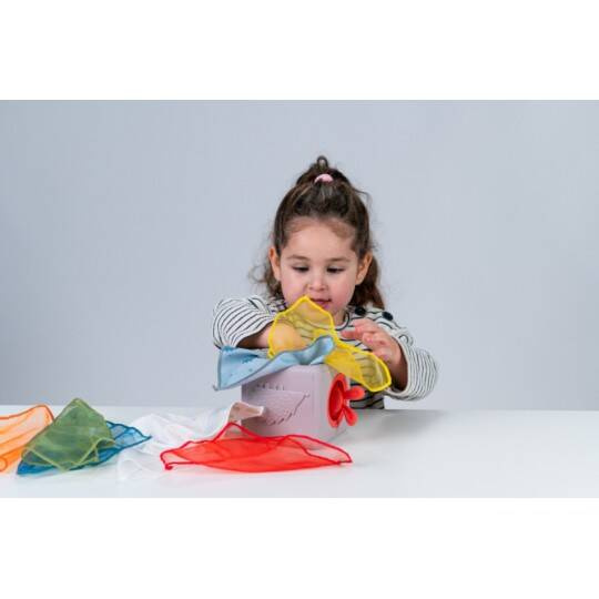 Magiczne pudełko na kolorowe chustki zachęca do niekończących się pomysłów na wyimaginowaną aktywną zabawę, ćwiczenia, ruch, gry i zajęcia rodzinne w liczenie, rozpoznawanie kolorów, chowanie, tańczenie z chustkami.