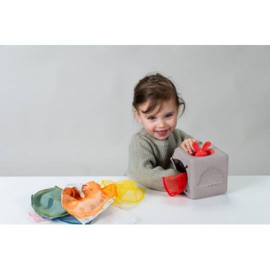 Magiczne pudełko z sensorycznymi chustkami i piłeczkami do zabawy marki Taf Toys.