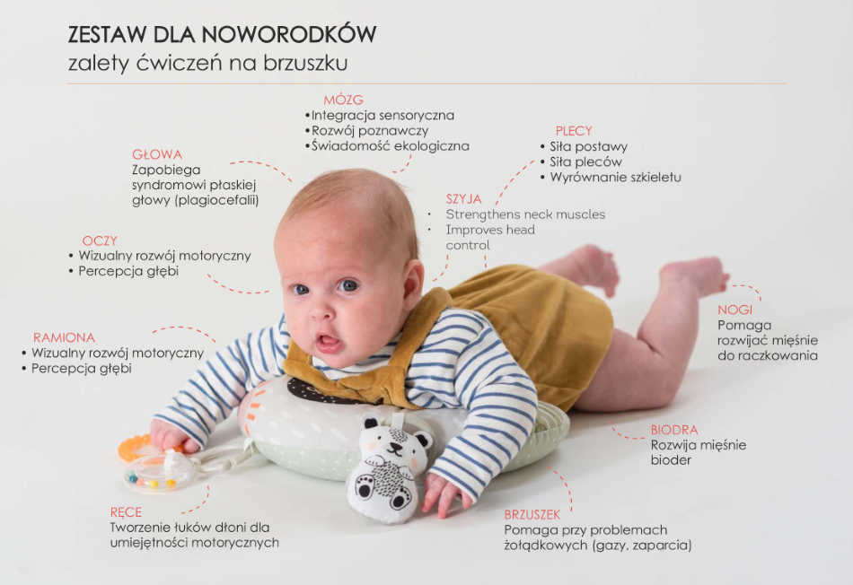Czas na brzuszku 0m+ - Spędzanie czasu na brzuszku jest kluczem do wspomagania rozwoju motorycznego dziecka. Czas na brzuchu ćwiczy podstawowe umiejętności, takie jak podnoszenie i obracanie głowy oraz wzmacnianie ramion i ramion dziecka w gotowości do przewracania się, raczkowania, siadania i chodzenia.