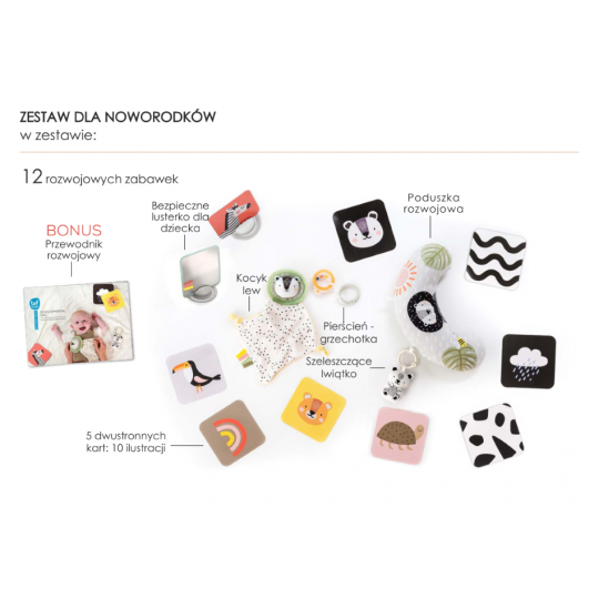 Zestaw zawiera 12 niezbędnych produktów rozwojowych dla noworodków: