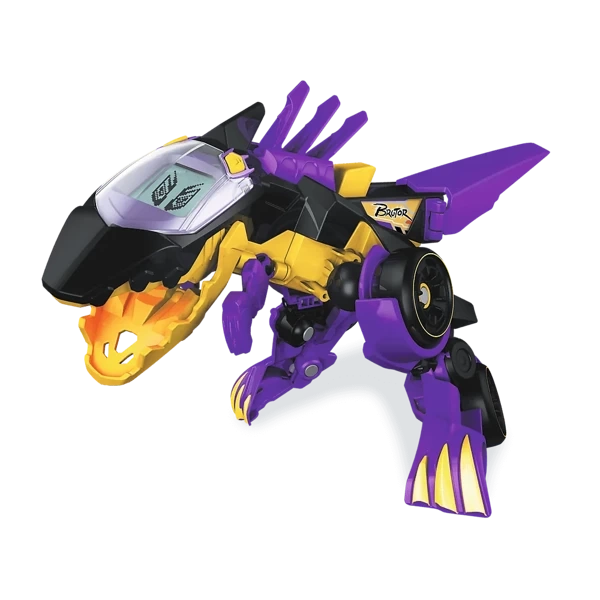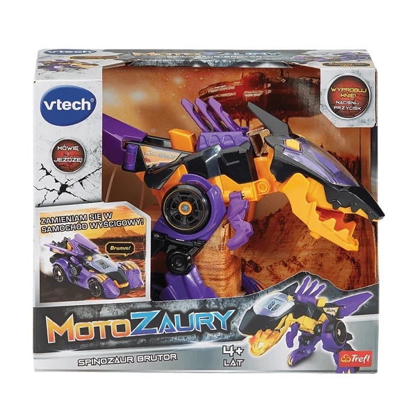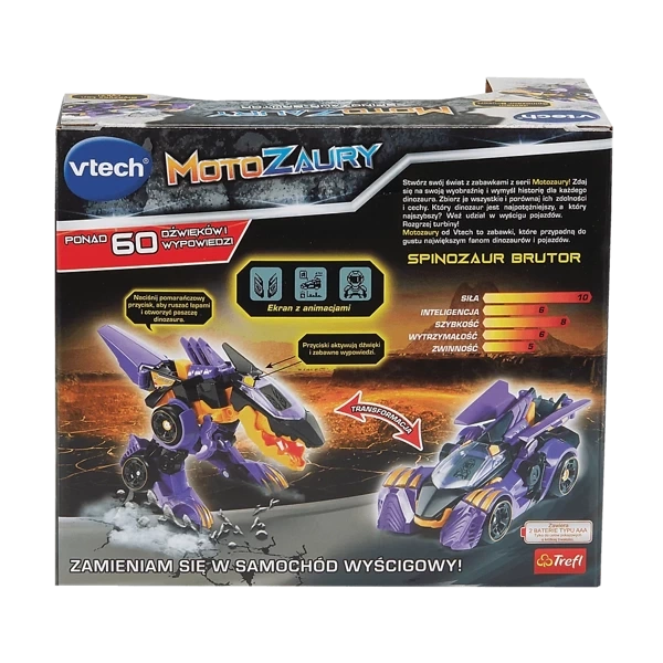 Brutor to spinozaur, który zamienia się w samochód wyścigowy! Przekształć dinozaura w pojazd lub na odwrót i zobacz jak zmieniają się animacje na ekranie LCD. Specjalne przyciski aktywują dźwięki, wypowiedzi i ruchome elementy, dzięki czemu zabawa jest jeszcze ciekawsza!